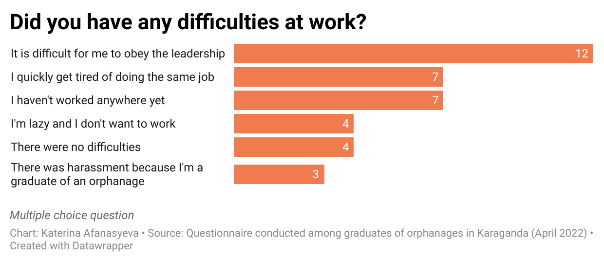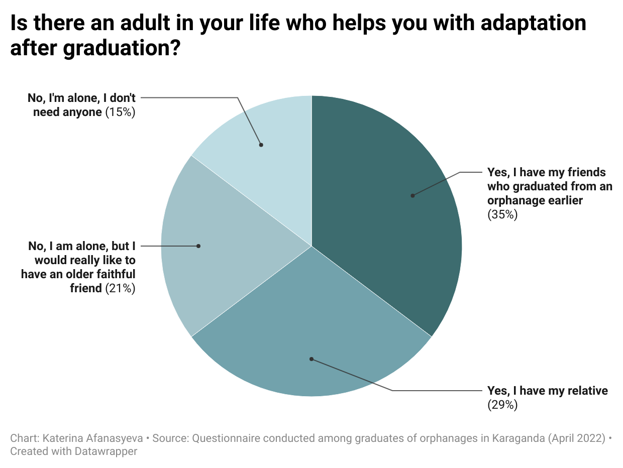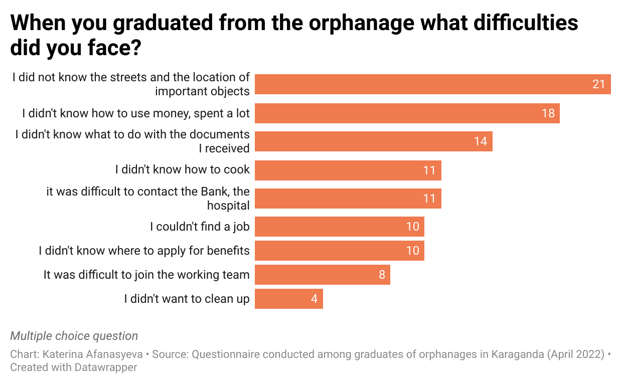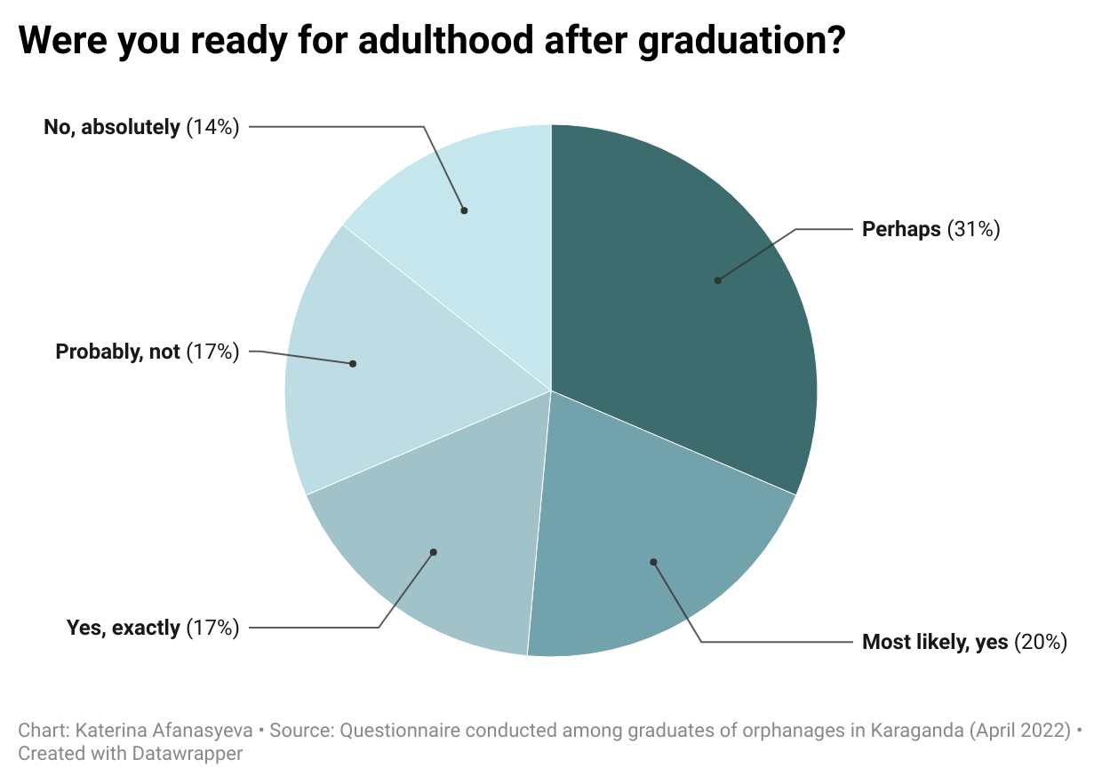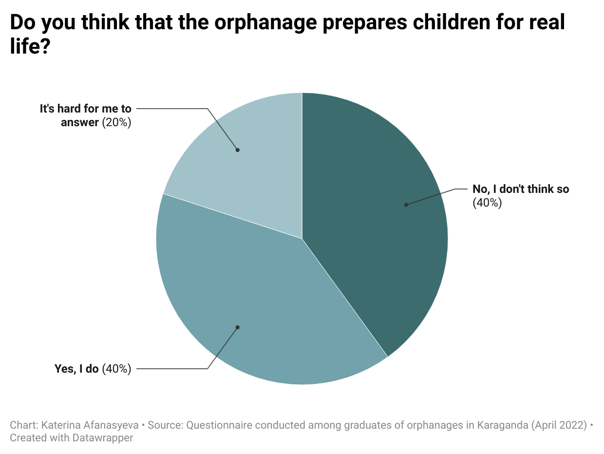Children living in orphanages are used to being supported by the state and do not think about where the money comes from. This lack of financial literacy has a very deplorable effect on life after graduation. 54% of survey respondents answered that it was difficult for them to properly manage money and that they spent a lot at first. Unfortunately, the system of orphanages does not teach even the most basic skills of financial literacy. Someone else pays for clothes, food, and utilities; there is no possibility of one's own financial earnings and disposal of funds for children.
